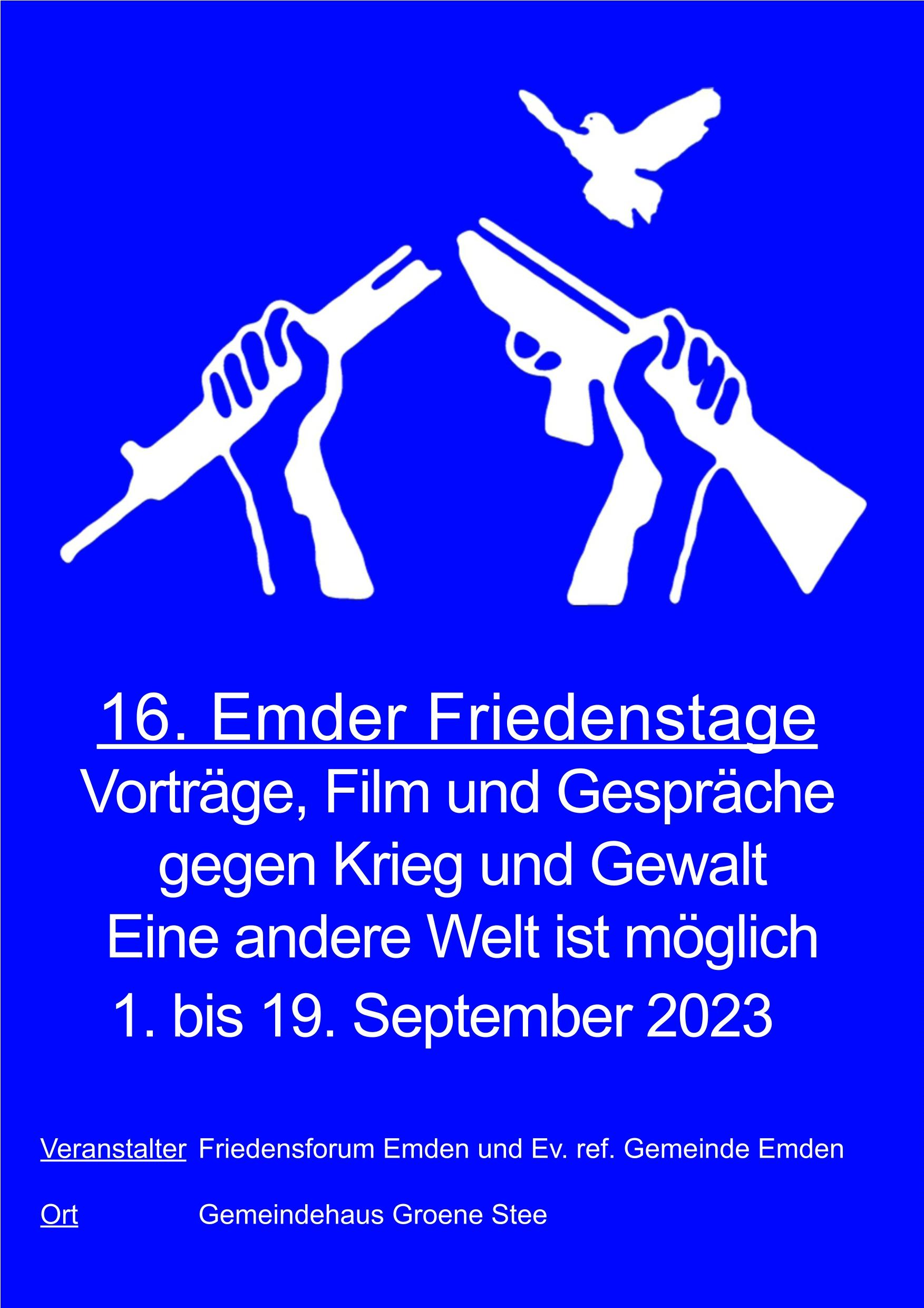 im Namen des Emder Friedensforum und aller Förderer darf ich Ihnen und Euch im Anhand das Programm der 16. Emder Friedenstage vom 1.-19. September 2023 zuschicken, verbunden mit der Herzlichen Einladung zu unseren Veranstaltungen und der Bitte um Weiterleitung unserer Einladung in Ihren/Euren Gruppen, Kreisen, Gemeinden und Netzwerken.