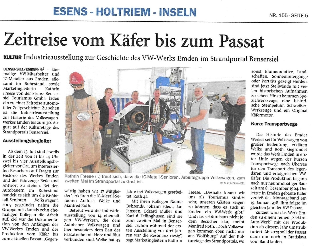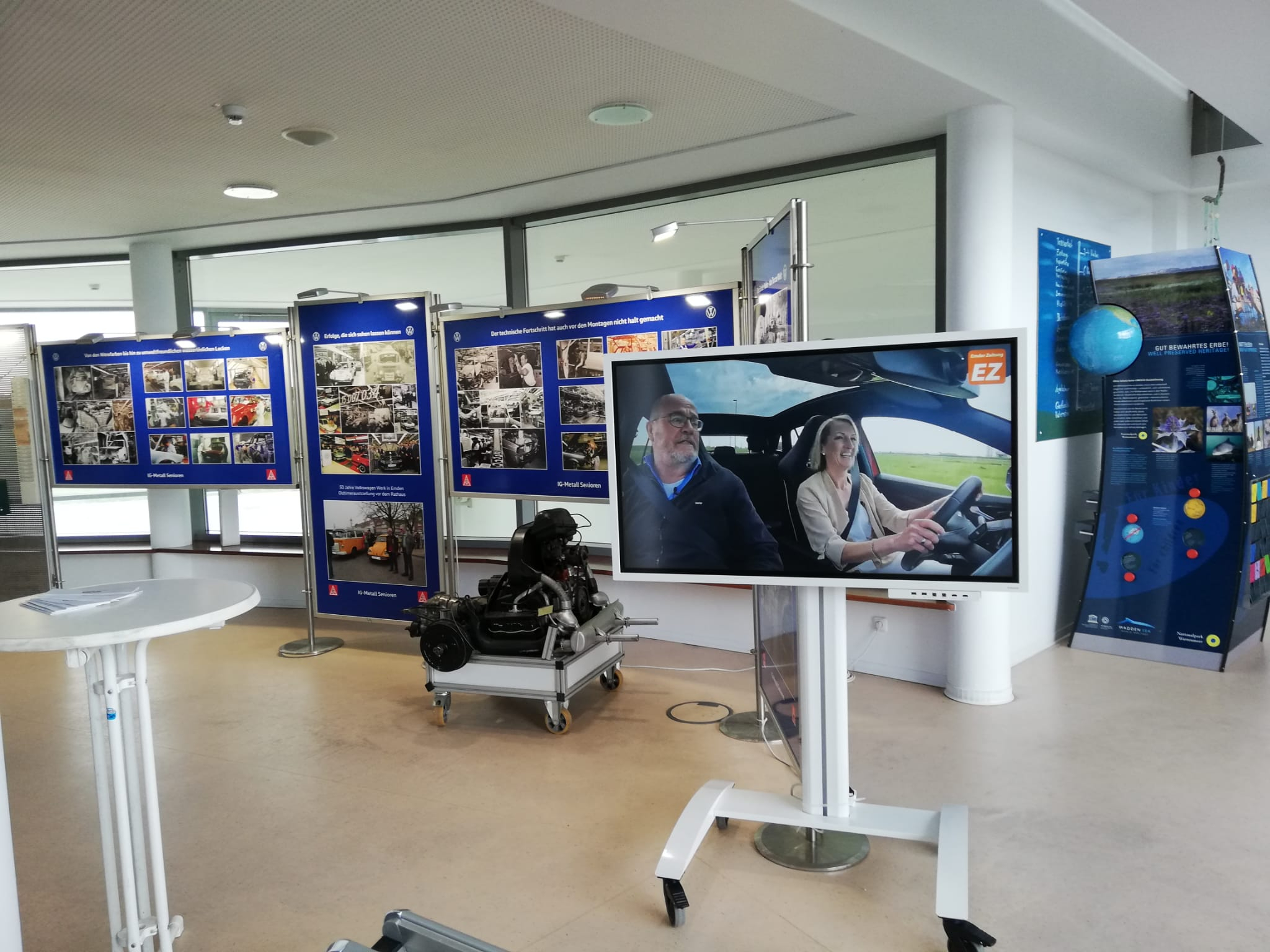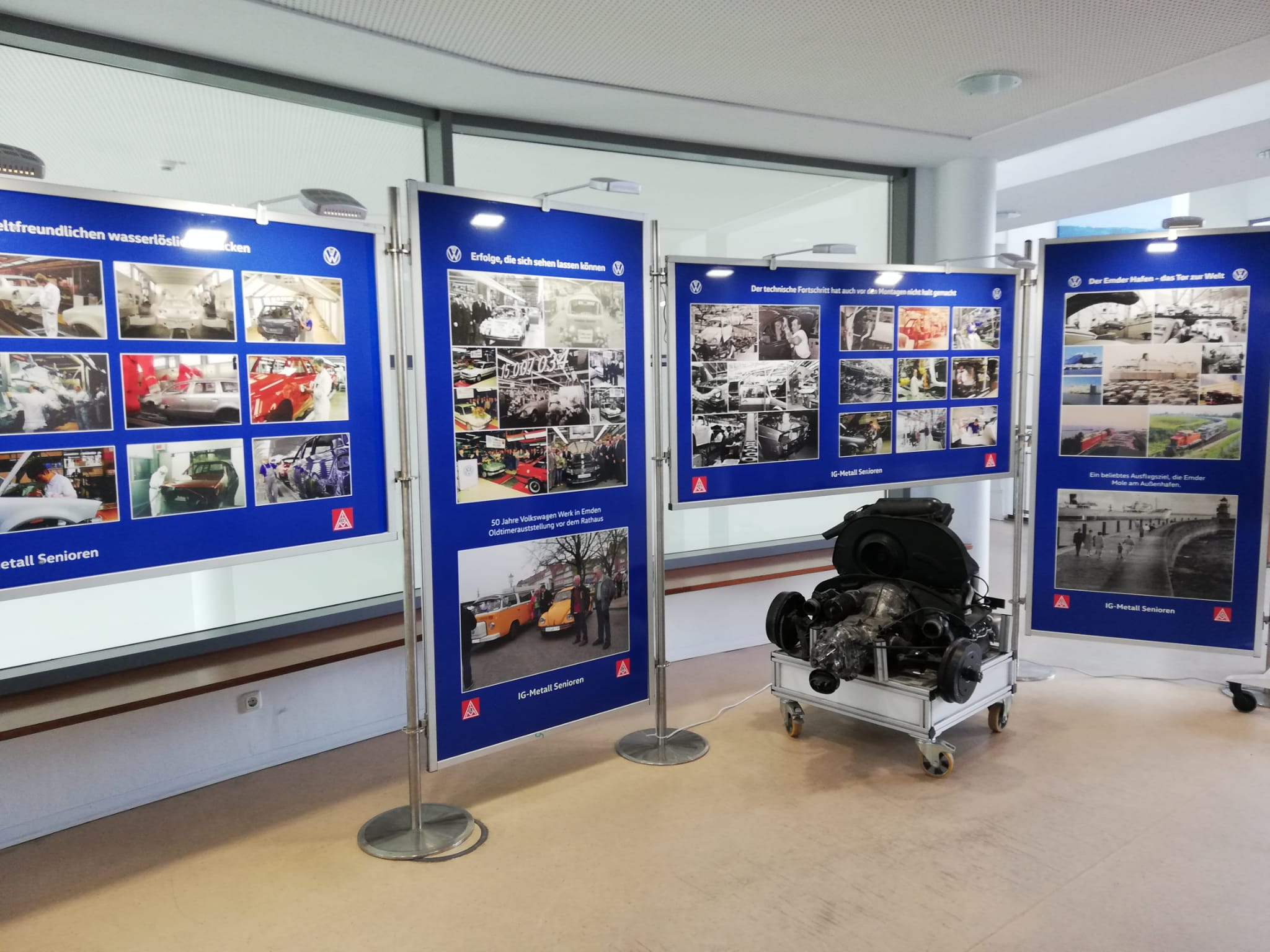 Der Arbeitskreis Geschichtswerkstatt Volkswagen hat viele schöne Ausstellungsstücke aus ihrer Sammlung in Bensersiel im schönen Strandportal aufgebaut. Zu sehen ist die Geschichte des Emder Volkswagen Werkes von der Käferfertigung 1964 bis zur Passatfertigung. In Aufnahmen, an Werkzeugen und an Schweißvorrichtungen kann man in die Geschichte eintauchen und die Zeit in Emden erleben. Die gesammelten und sehr gut gepflegten Ausstellungsstücke können dank unserer aktiven der Arbeitsgruppe ausgestellt und gezeigt werden. Zusehen ist die Ausstellung bis zum 30. August 2022 auf der Kulturetage des Strandportals Bensersiel.