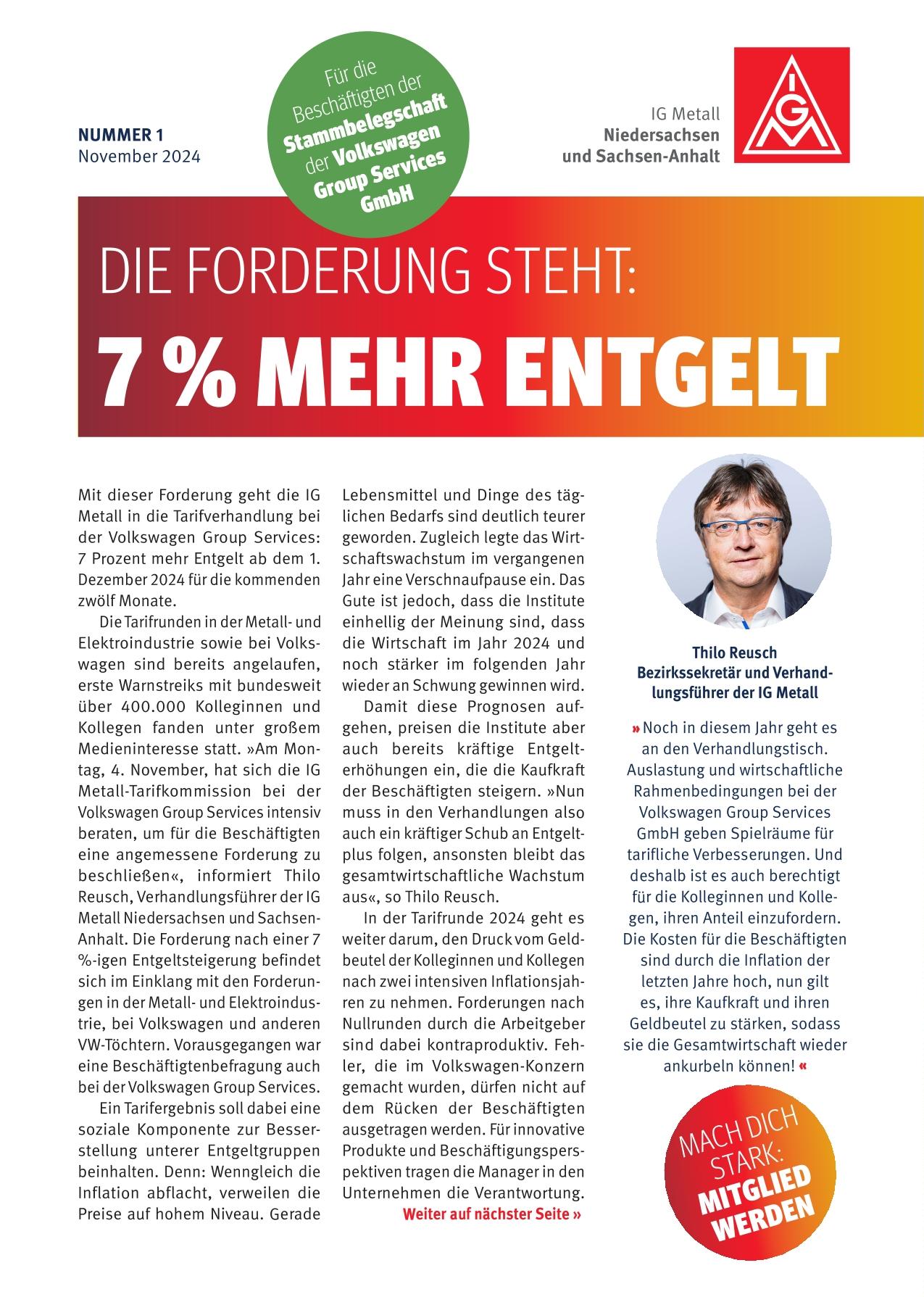 Dezember 2024 für die kommenden zwölf Monate. Die Tarifrunden in der Metall- und Elektroindustrie sowie bei Volkswagen sind bereits angelaufen,erste Warnstreiks mit bundesweit über 400.000 Kolleginnen und Kollegen fanden unter großem Medieninteresse statt. »Am Montag, 4. November, hat sich die IG Metall-Tarifkommission bei der Volkswagen Group Services intensiv beraten, um für die Beschäftigten eine angemessene Forderung zu beschließen«, informiert ThiloReusch, Verhandlungsführer der IG
