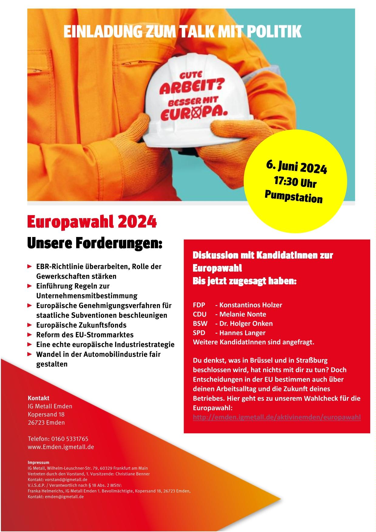 Einladung zum Talk mit der Politik 06.Juni 2024 17:30 Uhr Pumpstation Emden