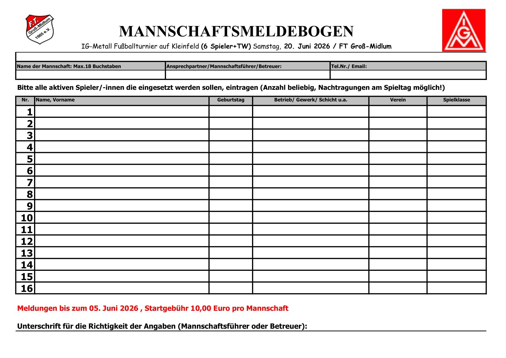 Anpfiff für unser Fußballturnier: Am 20.06.2026 rollt der Ball auf dem Sportplatz FT Groß-Midlum. Teams, Fans sowie Kolleginnen und Kollegen sind willkommen. Sei dabei und melde dein Team an!