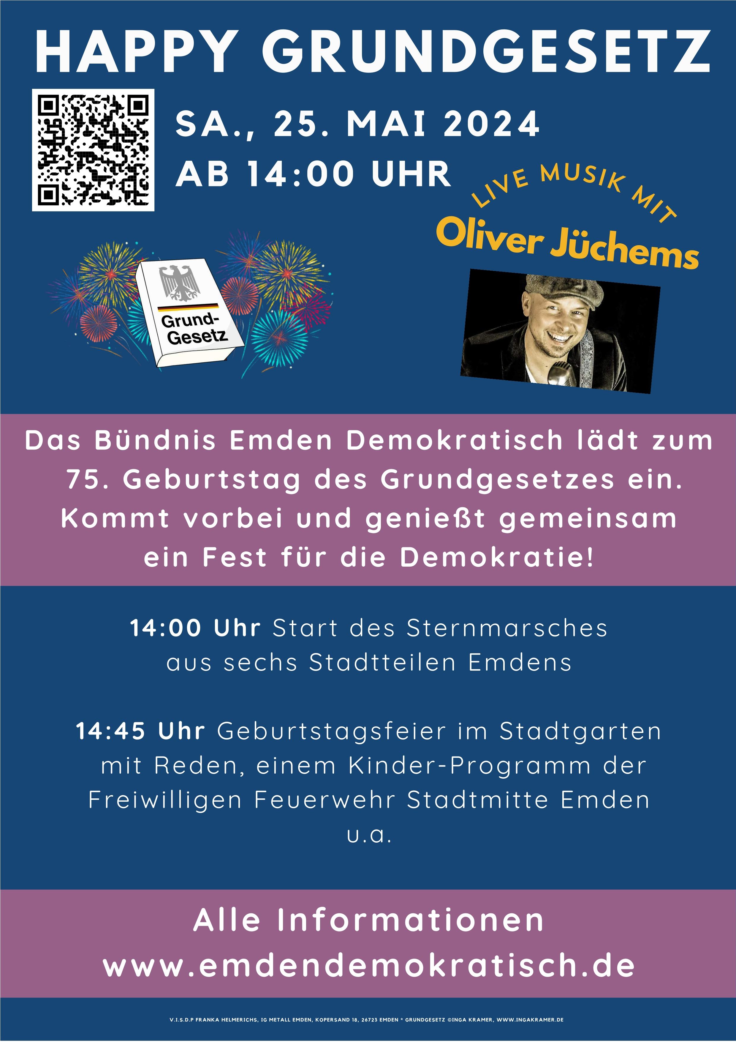 Das Bündnis Emden Demokratisch lädt zum 75. Geburtstag des Grundgesetzes ein. Kommt vorbei und genießt gemeinsam ein Fest für die Demokratie! Samstag 25.Mai 2024 Ab 14:00 Uhr