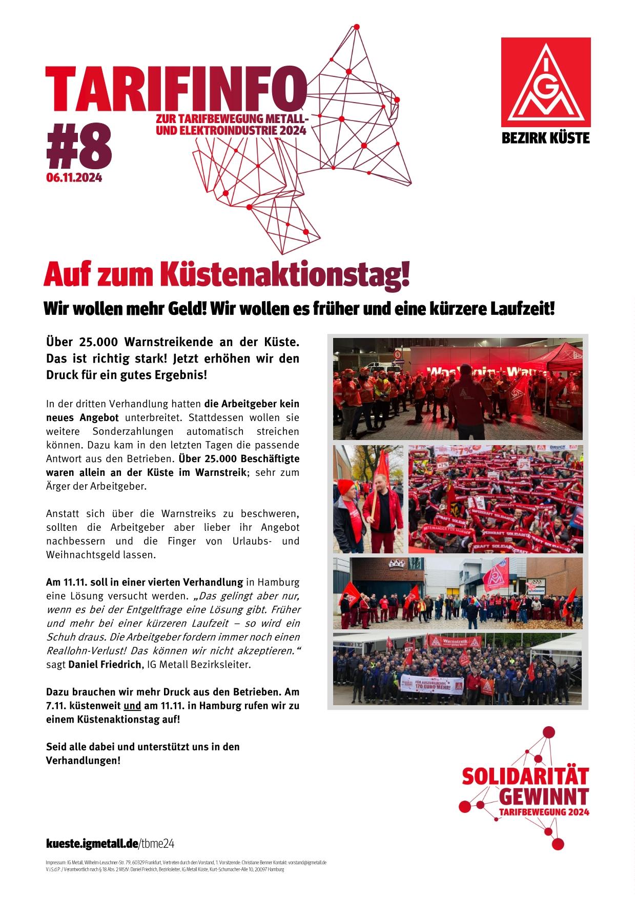 Am 11.11. soll in einer vierten Verhandlung in Hamburg eine Lösung versucht werden. „Das gelingt aber nur, wenn es bei der Entgeltfrage eine Lösung gibt. Früher und mehr bei einer kürzeren Laufzeit - so wird ein Schuh draus. Die Arbeitgeber fordern immer noch einen Reallohn-Verlust! Das können wir nicht akzeptieren.“ sagt Thomas Preuß 2. Bevollmächtigter der IG Metall Emden.