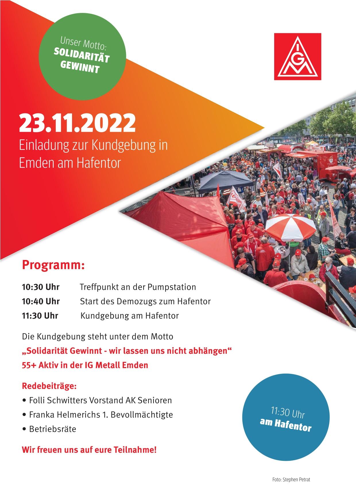 Am Mittwoch, den 23.11.2022 startet ab 10:30 Uhr an der Pumpstation in Emden ein Demozug zum Hafentor. Organisiert und ins Leben gerufen von ehrenamtlichen KollegInnen der IG Metall Emden „55+Aktiv in der IG Metall“.