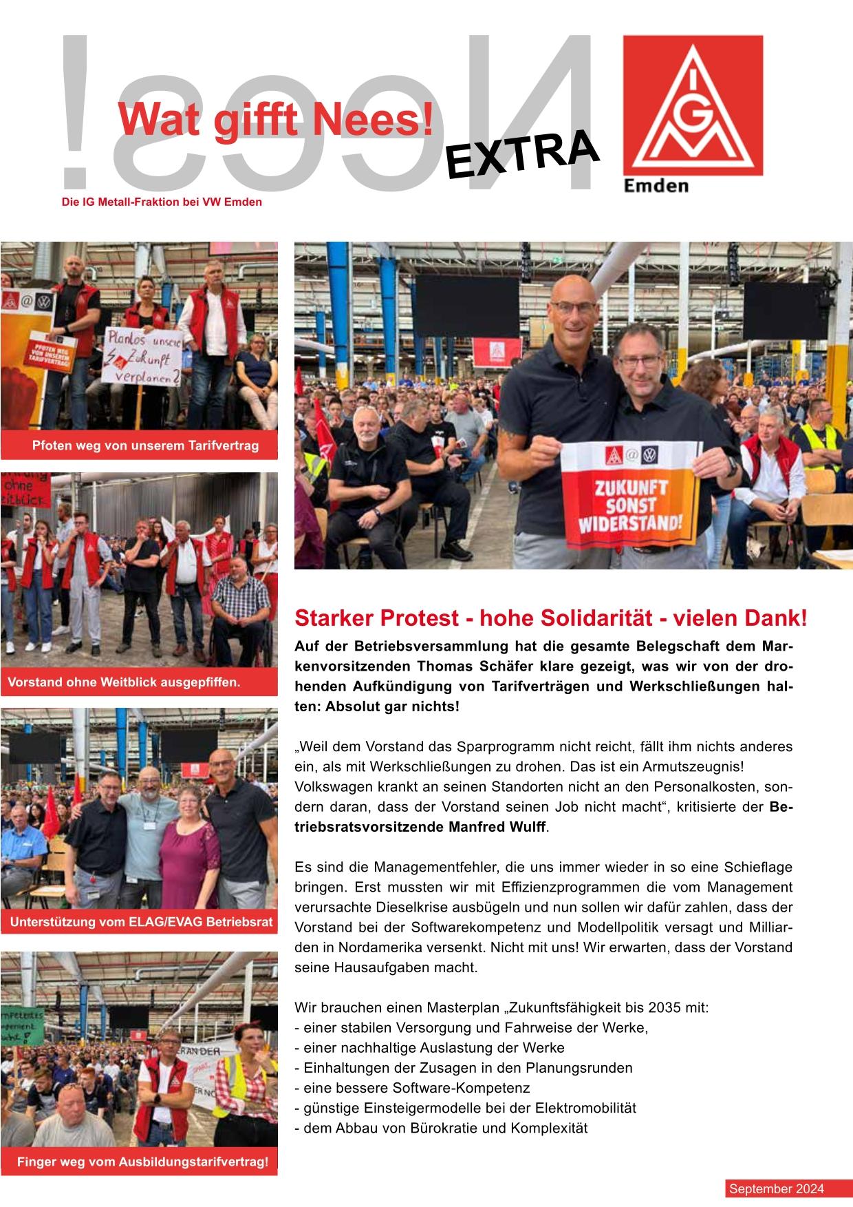Wulff adressierte klar an den Vorstand: „Der Vorstand hat das Schwert rausgeholt und ins Herz von der Belegschaft bei Volkswagen gestoßen. Daher stellen wir in Emden wie auch an allen anderen Standorten sämtliche Aktivitäten zum Ergebnisverbesserungsprogramm ein. Bei Volkswagen haben wir immer alles gemeinschaftlich gelöst. Wir erwarten, dass der Vorstand an den Verhandlungstisch zurückkehrt und die Wirtschaftlichkeit und Beschäftigungssicherung wieder gleichrangig behandelt.“