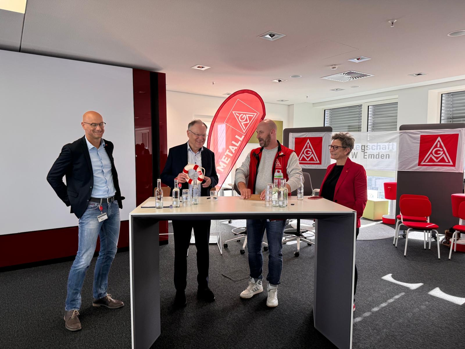 Herbert de Vries, stellvertretender BR-Vorsitzender: „Wir haben Stephan Weil mit auf dem Weg gegeben, dass sichere und gut bezahlte Arbeitsplätze im Einklang mit der Wirtschaftlichkeit stehen müssen. Die Belegschaft hat eine hohe Flexibilität bewiesen und den Standort Emden in Rekordzeit auf die Elektromobilität erfolgreich vorbereitet.“