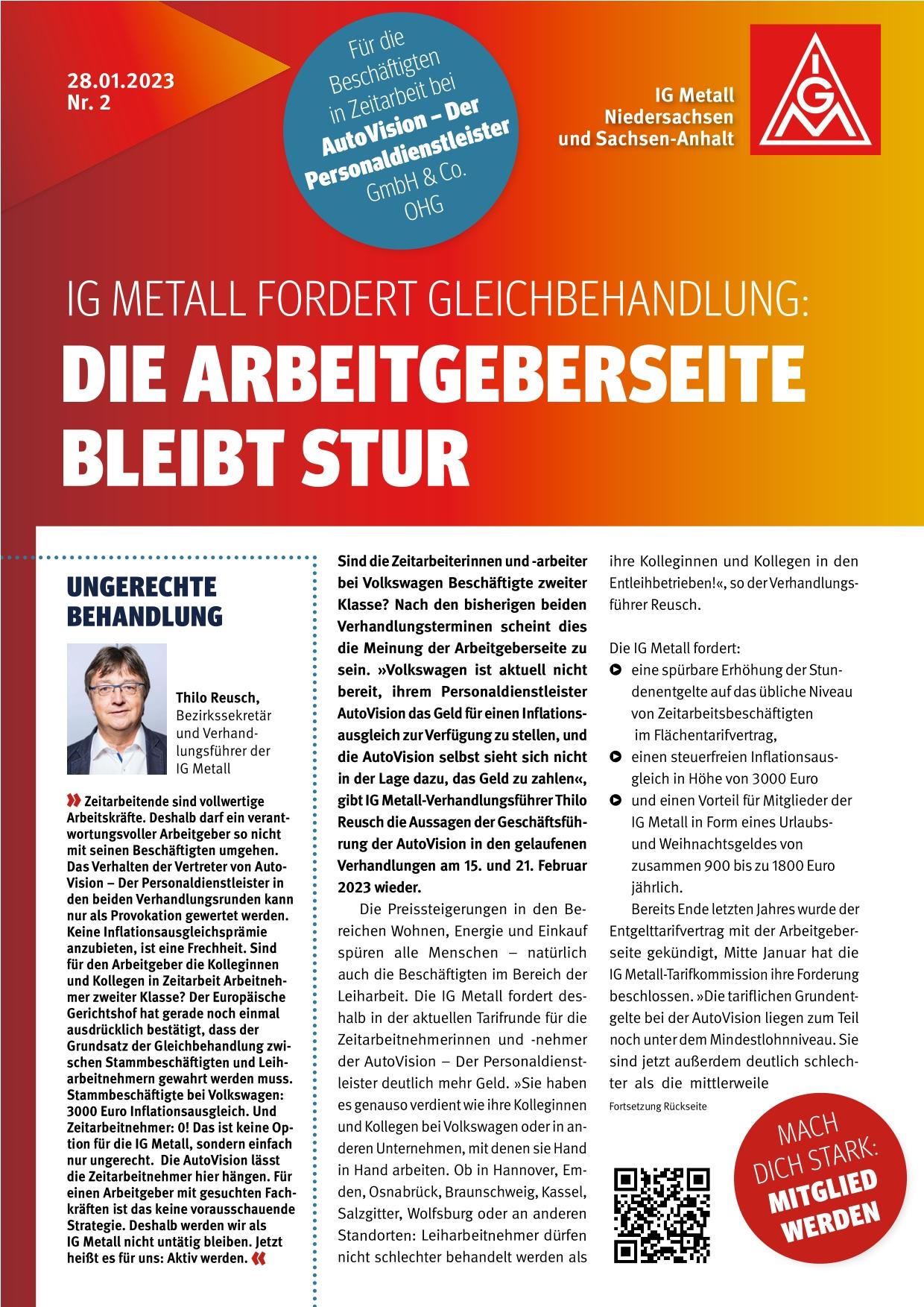 Sind die Zeitarbeiter bei Volkswagen Beschäftigte zweiter Klasse? Nach den beiden bisherigen Verhandlungsterminen scheint dies die Sichtweise der Arbeitgeberseite zu sein. „Volkswagen ist aktuell nicht bereit, der AutoVision das Geld für einen Inflationsausgleich zur Verfügung zu stellen, und die AutoVision selbst sieht sich nicht in der Lage dazu, das Geld zu zahlen“, berichtet IG Metall-Verhandlungsführer Reusch die Aussagen der Geschäftsführung der AutoVision aus den gelaufenen Verhandlungen am 15. und 21. Februar 2023.